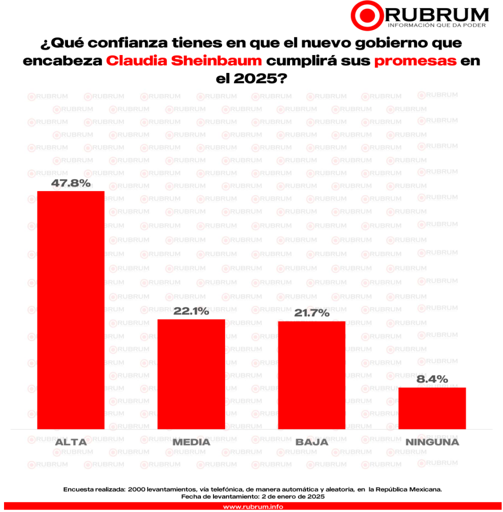 - Confianza: En mayoría, los encuestados tiene alta confianza de que el gobierno de la presidenta Claudia Sheinbaum cumplirá con sus promesas en el 2025.