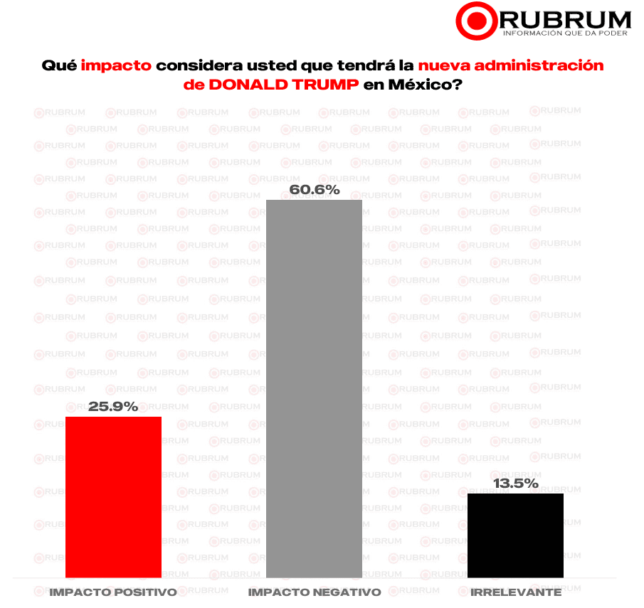 Un 60.6% por ciento, considera que su segunda gestión tendrá un impacto negativo en México. Por otro lado, el 25.9% evalúa el cambio de forma positiva. La minoría, con un 13.5% califica la ascensión de Trump como “irrelevante” en la política mexicana.