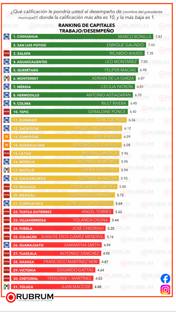 En la última encuesta ciudadana de RUBRUM, respecto al desempeño general de los presidentes municipales de todas las capitales del país, Marco Bonilla alcalde Chihuahua se destacó posicionándose en el puesto número uno.