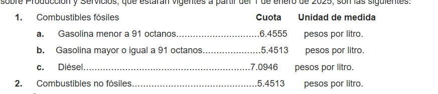 Las cuotas aplicables a los combustibles automotrices a que se refiere la actualización recién publicada a la Ley del Impuesto Especial sobre Producción y Servicios, que estarán vigentes a partir del 1 de enero de 2025, son las siguientes: