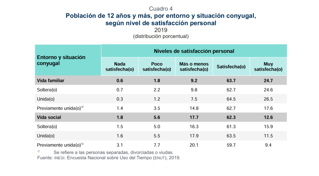 En cuanto a la satisfacción que produjo la vida familiar por situación conyugal, la población unida declaró en mayor medida estar satisfecha(o) y muy satisfecha(o), con 64.5 y 26.5 %, respectivamente; esto traducido en un 7 de 10 mexicanos.