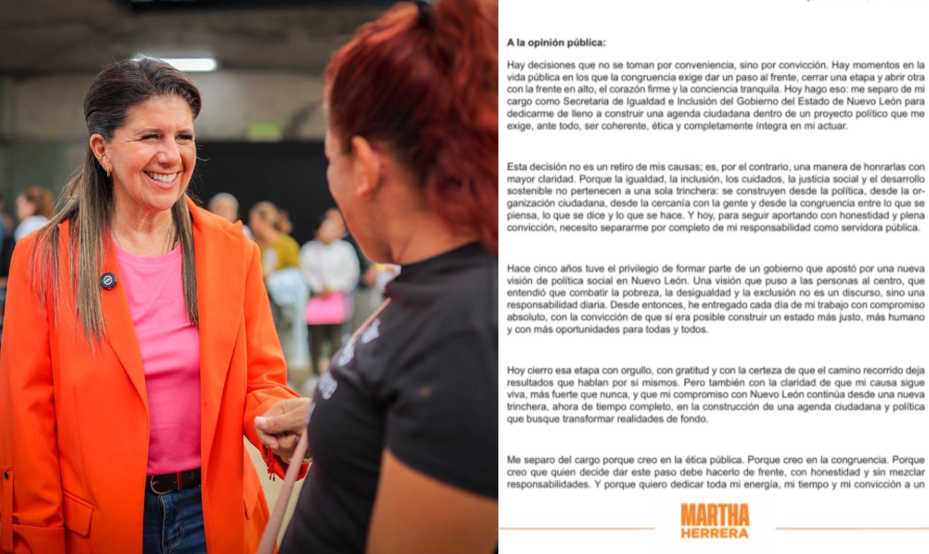 Martha Herrera González anunció este lunes su renuncia como titular de la Secretaría de Igualdad e Inclusión del Gobierno de Nuevo León, encabezado por el gobernador Samuel García.