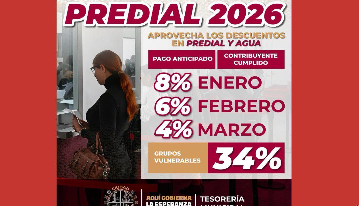 Desde el 2 de enero de 2026, los contribuyentes pueden acceder a descuentos de 8%, 6% y 4% por pago anual anticipado del impuesto predial y el servicio de agua potable en enero, febrero y marzo, respectivamente.