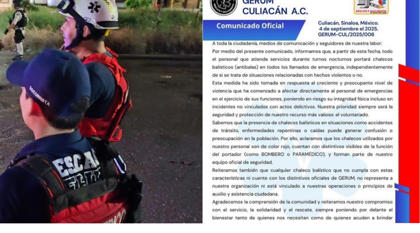 El Grupo de Respuesta y Emergencias Médicas (GERUM) Culiacán A.C. anunció que su personal portará chalecos antibalas durante las operaciones, como medida de protección ante la creciente violencia en la región.