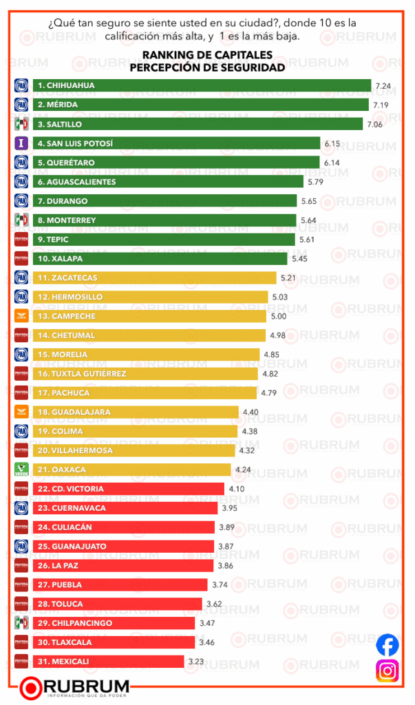 Mexicali es calificado al final de este ranking, lo que refleja una mayor percepción de inseguridad. Tlaxcala, Chilpancingo, Toluca y Puebla también son las capitales con mayor inseguridad.