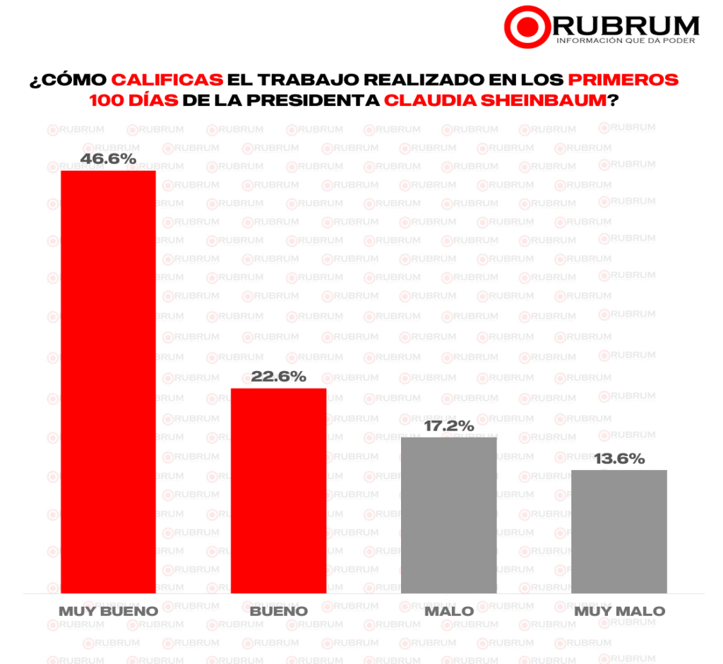El desempeño de la mandataria durante los primeros 100 días de su gobierno ha sido calificado por el 46.6% y 22.6% de los mexicanos encuestados como «muy bueno» y «bueno» respectivamente.