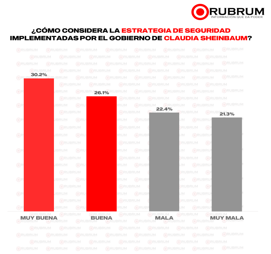 - Seguridad: La estrategia de seguridad obtuvo una aprobación del 56.3 por ciento (Muy Buena o Buena) y una desaprobación del 43.7 por ciento.