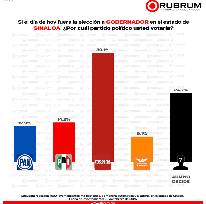 La encuesta de preferencia realizada por RUBRUM en febrero con respecto a la elección del 2027 en Sinaloa, arrojó que si hoy fuera la elección a gobernador en el estado un 39.1% por ciento votaría por Morena.