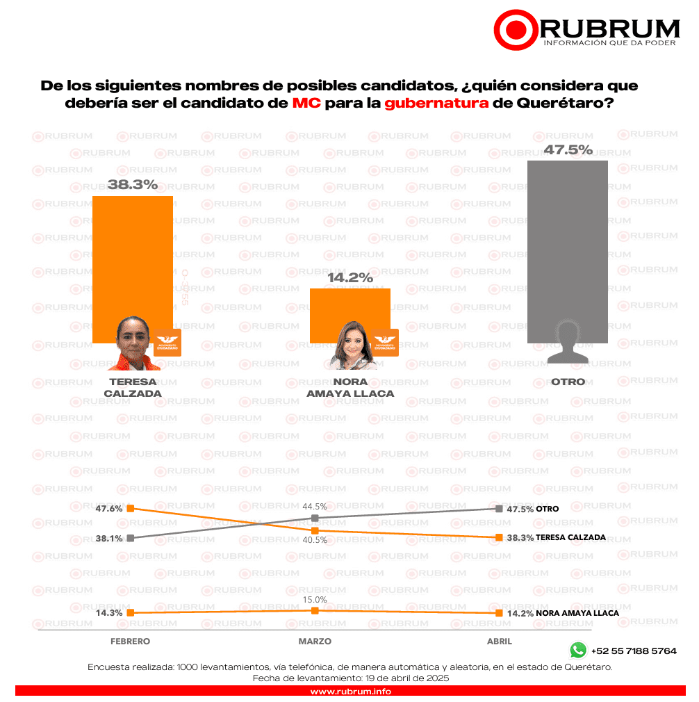 Encuesta realizada: 1000 levantamientos, vía telefónica, de manera automática y aleatoria, en el estado de Querétaro. Fecha de levantamiento: 19 de abril de 2025