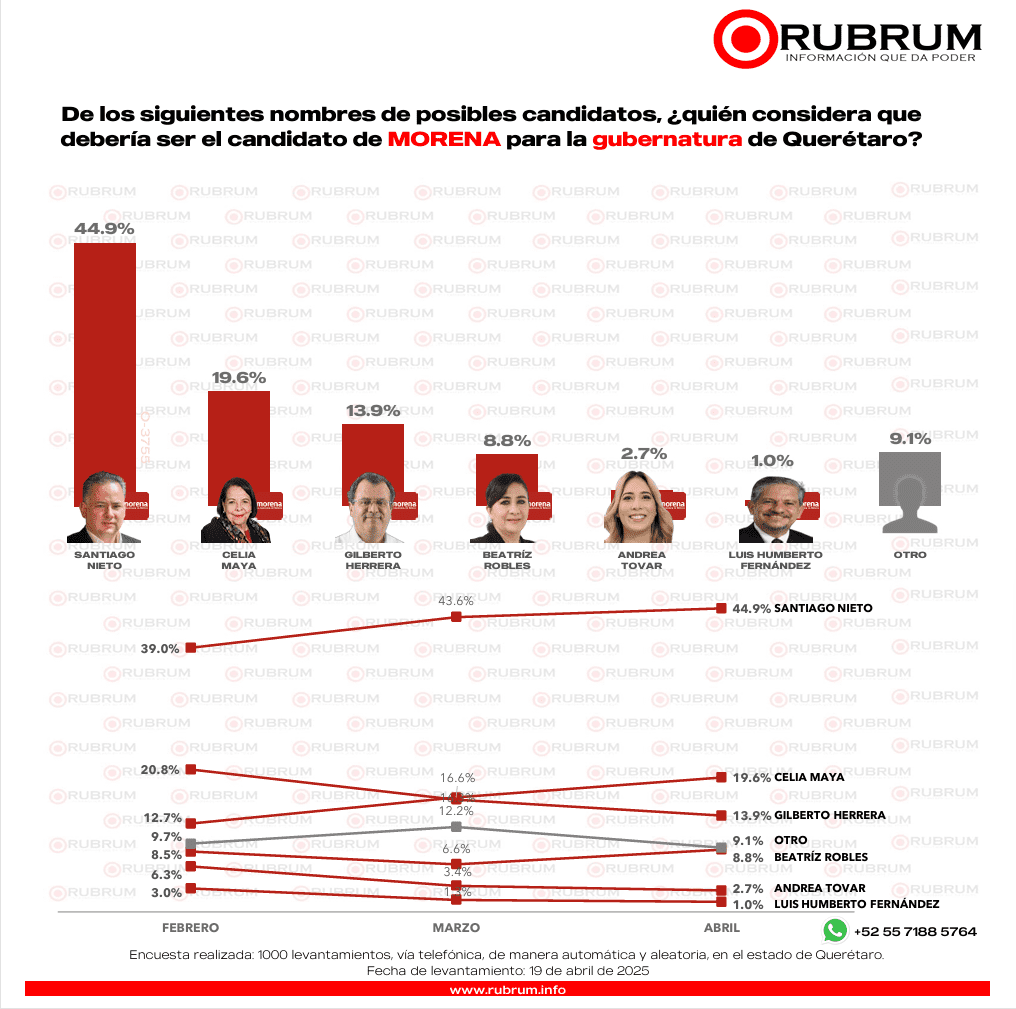 - MORENA: Santiago Nieto lidera el sondeo por encima de Celia Maya y Gilberto Herrera.