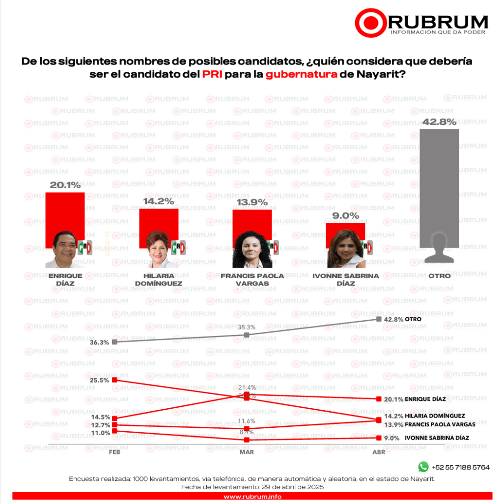 RUBRUM presenta su más reciente encuesta sobre el panorama actual de las preferencias electorales en Nayarit con miras a la gubernatura de 2027. Esta encuesta mide la intención de voto por partido y la intención de voto interno.