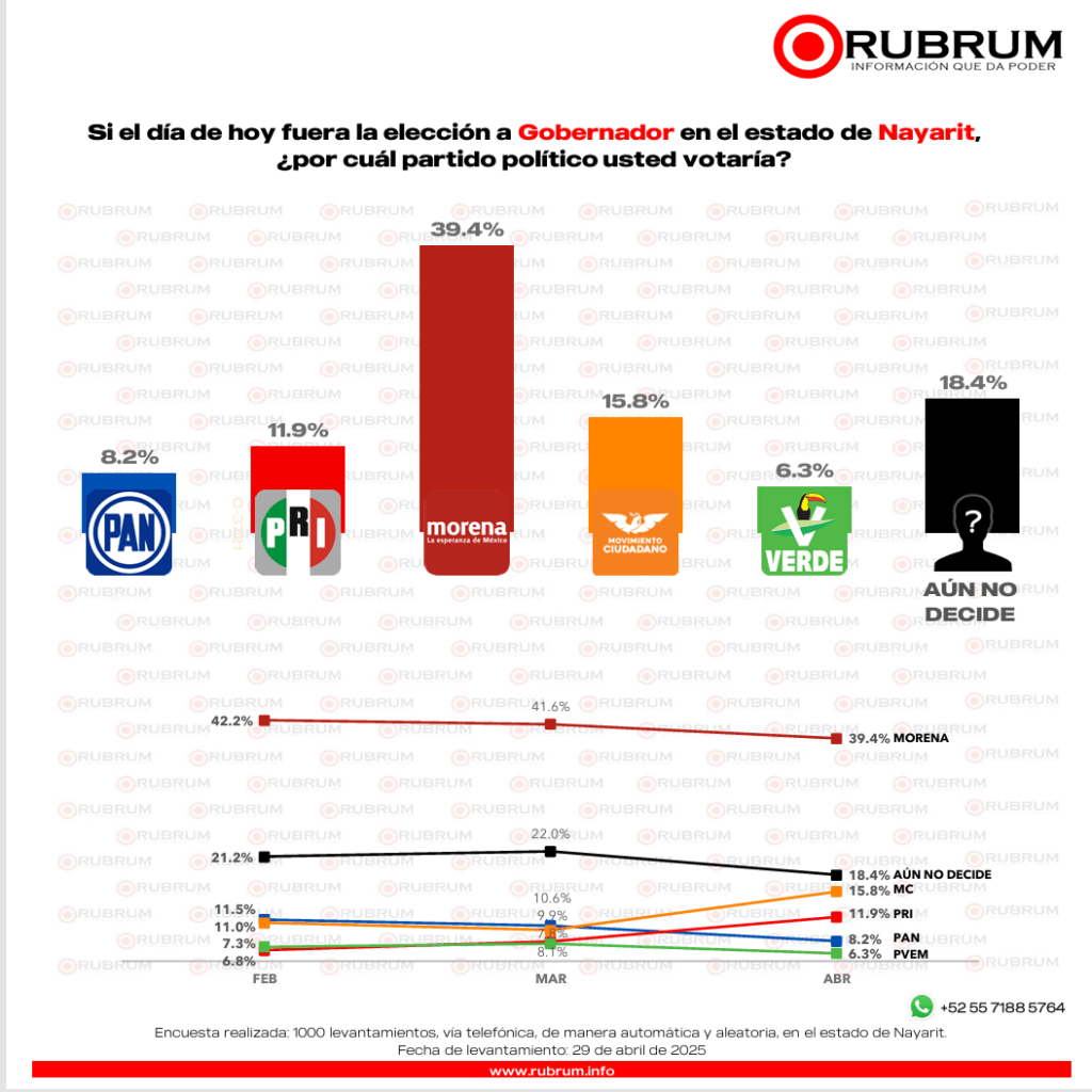 La encuesta de preferencia realizada por RUBRUM en abril con respecto a la elección del 2027 en Nayarit, arrojó que si hoy fuera la elección a gobernador en el estado un 39.4% por ciento votaría por Morena.