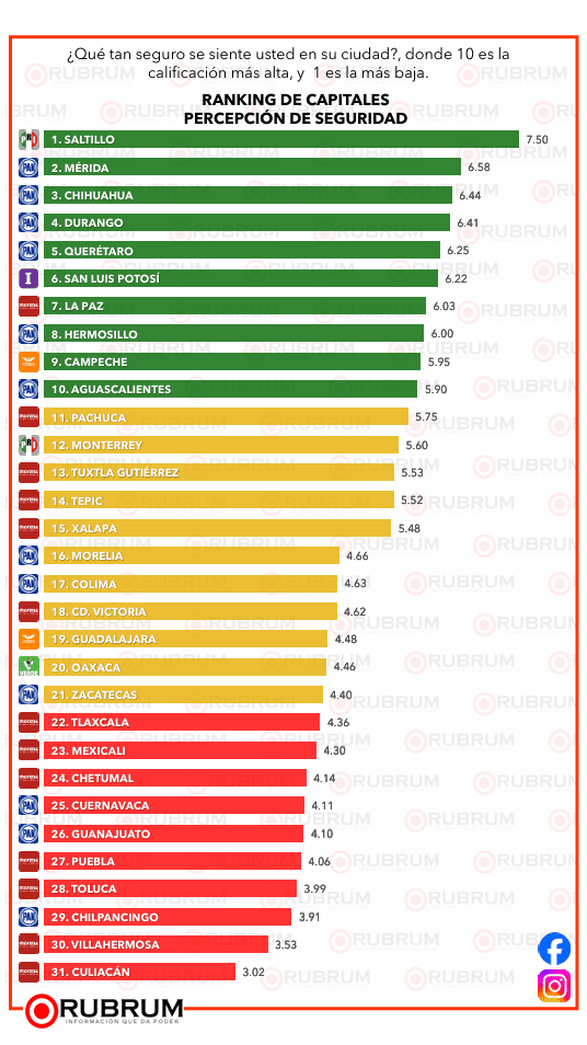 - En percepción de seguridad, Saltillo ocupa el primer lugar. Le sigue Mérida y Chihuahua. Las tres capitales se mantienen rotándose en el primer, segundo y tercer lugar respectivamente. Mientras que Culiacán, Villahermosa y Chilpancingo son los ayuntamientos peor evaluados.