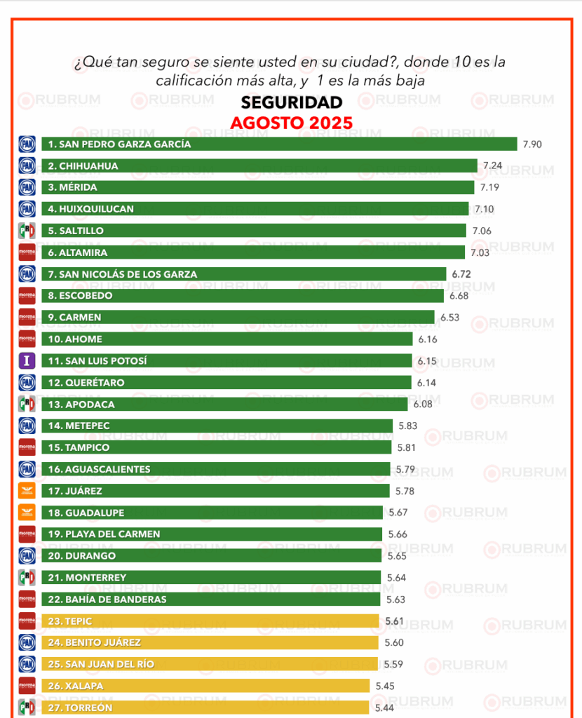 San Pedro Garza García es la ciudad con mejor percepción de seguridad, le continúa Chihuahua, Mérida, Huixquilucan y Saltillo.