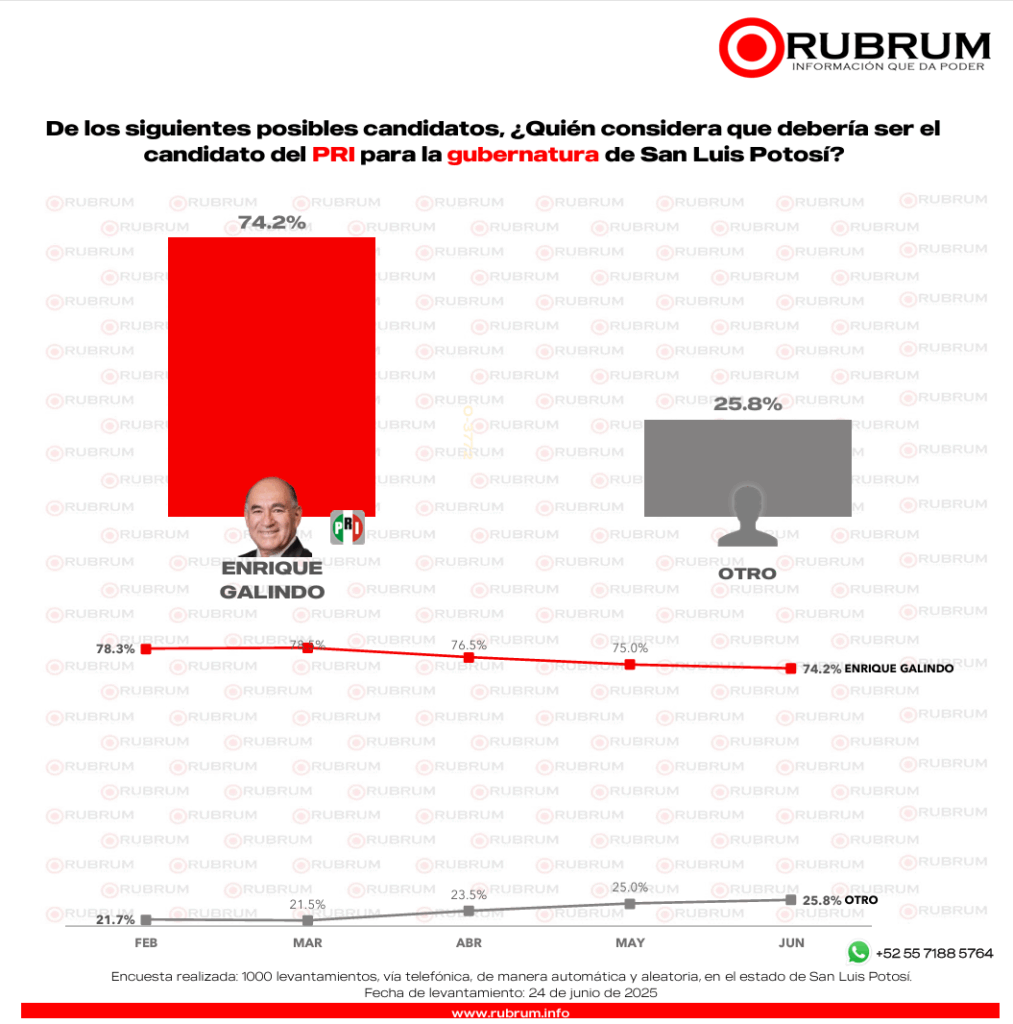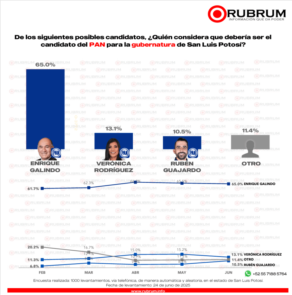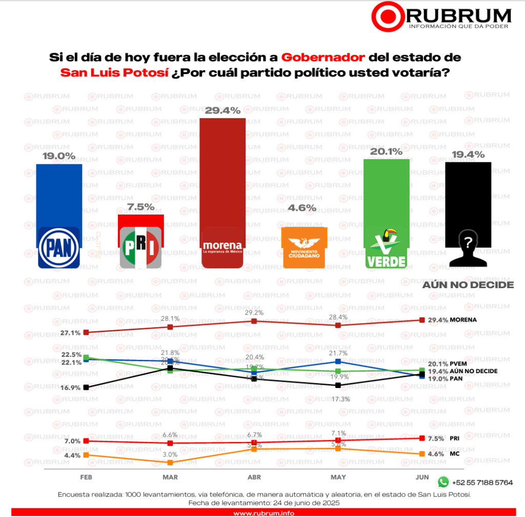 La encuesta de preferencia ciudadana realizada por RUBRUM en junio con respecto a la elección del 2027 en San Luis Potosí, arrojó que si hoy fuera la elección a gobernador en el estado un 29.4% por ciento votaría por Morena.