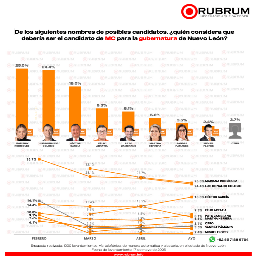 • MC: Mariana Rodríguez y Luis Donaldo Colosio compiten por el primer lugar en Movimiento Ciudadano. Luego le siguen Héctor García, Félix Arratia y el Pato Zambrano.