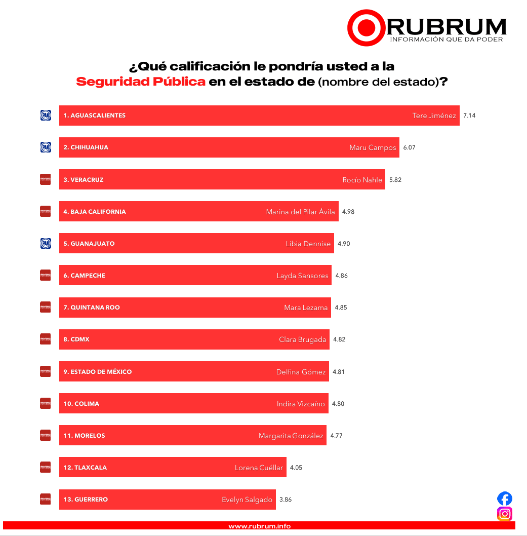 Este es uno de los ejes más importantes para el país. De los 1000 levantamientos realizados en los estados encuestados gobernados por mujeres que tienen la mejor percepción de seguridad en México son:
