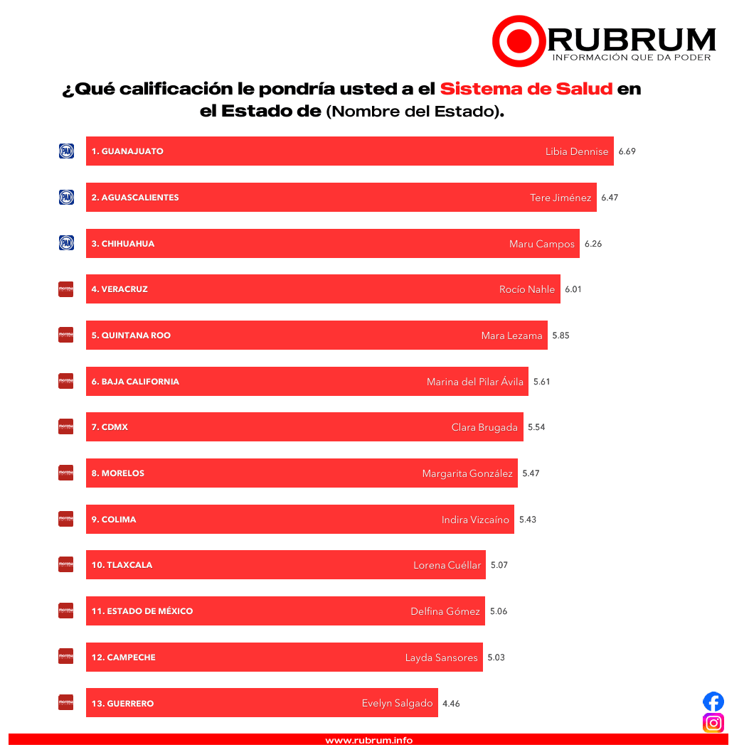 Referente al tema de salud, Guanajuato encabeza la lista con el mejor servicio. En segundo y tercer lugar se ubica Aguascalientes y Chihuahua. Le siguen Veracruz y Quintana Roo.