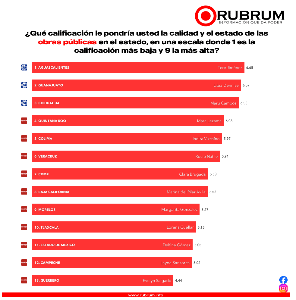 En contraste, las gobernadoras peor evaluados son Layda Sansores de Campeche y Lorena Cuellar de Tlaxcala. El último lugar se posiciona Evelyn Salgado de Guerrero con un 4.83 de calificación.