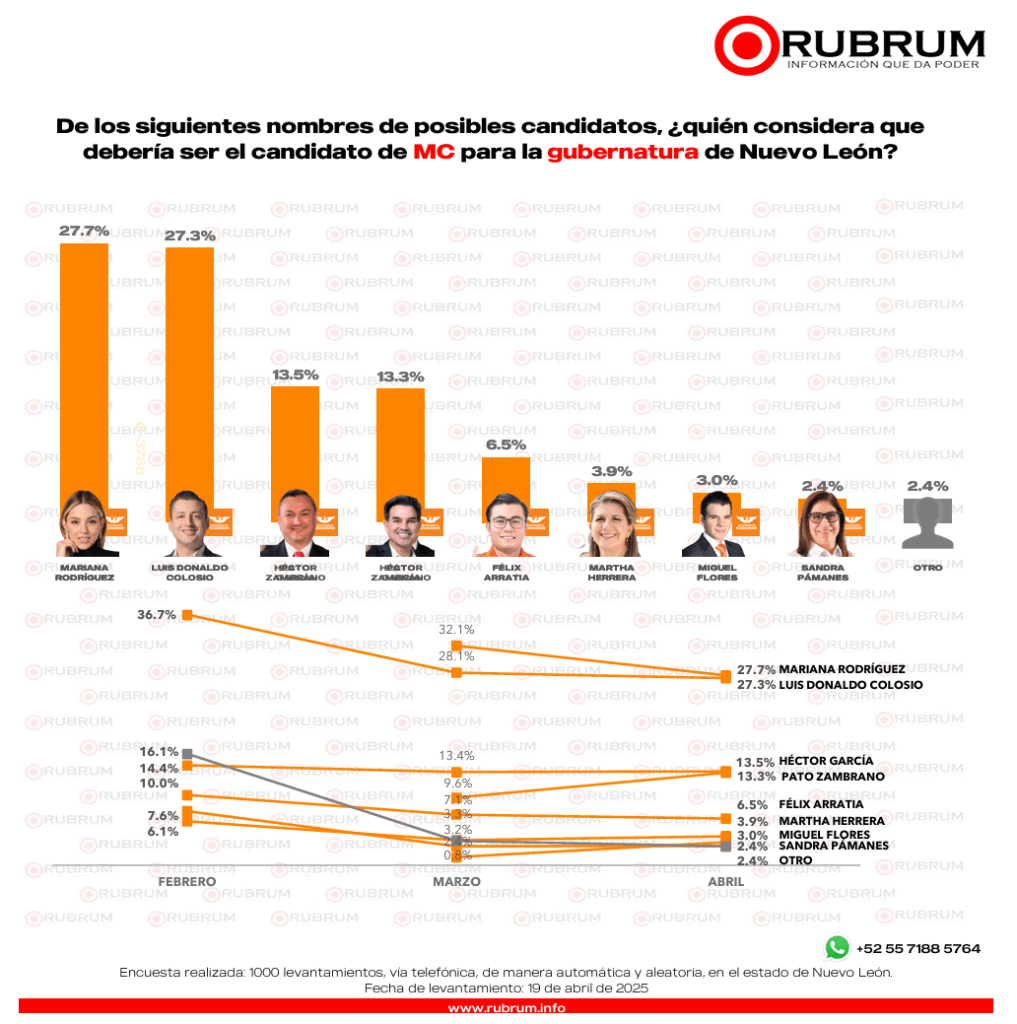 RUBRUM presenta su encuesta de abril sobre el panorama electoral en Nuevo León con miras a la gubernatura de 2027. Esta encuesta ciudadana mide la intención de voto por partido y la intención de voto interno.