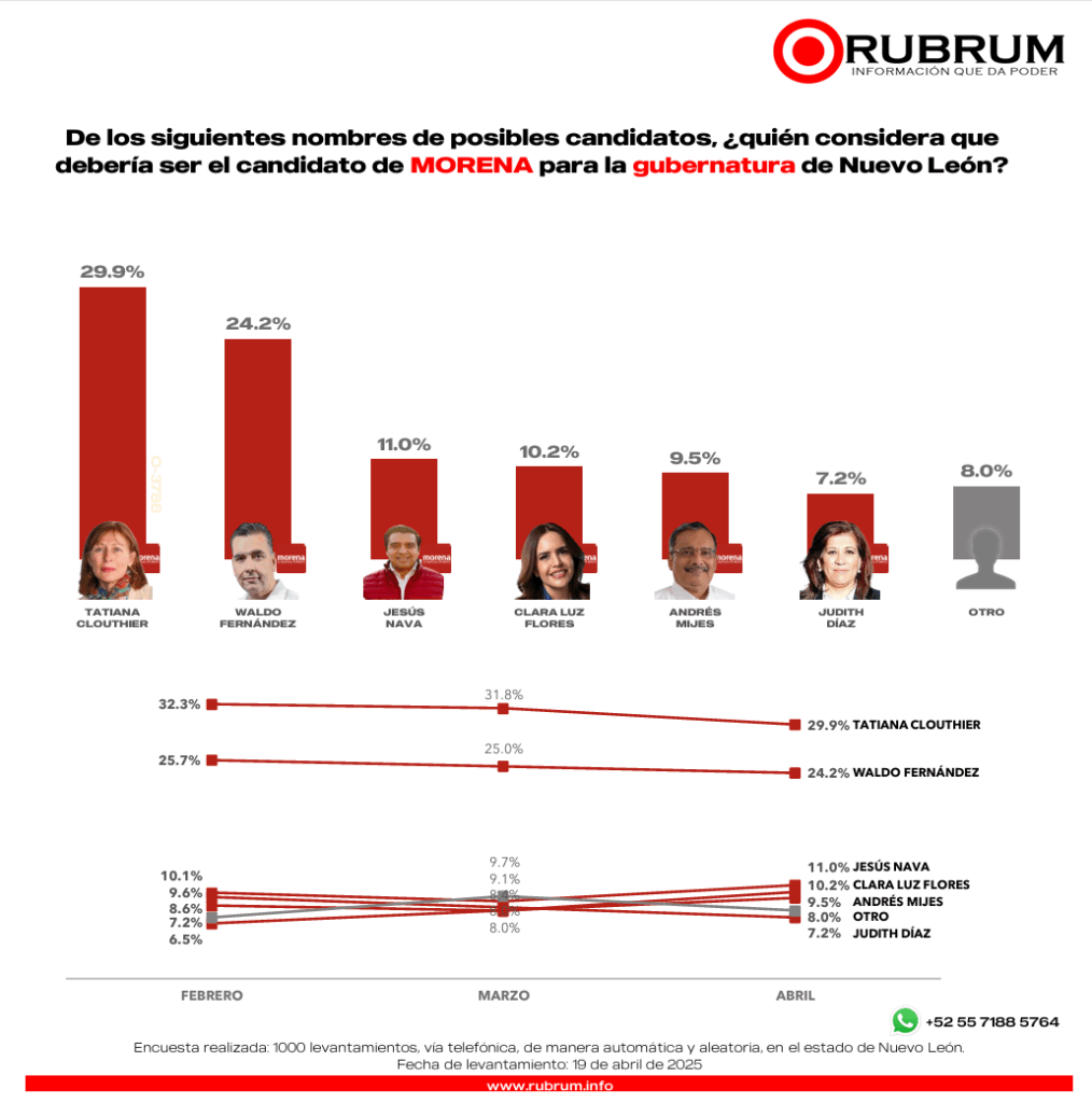 La encuesta de preferencia realizada por RUBRUM en abril con respecto a la elección del 2027 en Nuevo León, arrojó que si hoy fuera la elección a gobernador en el estado un 30.3% por ciento votaría por Morena. Es decir que 3 de cada 10 neoloneses votarían por el partido oficialista federal.
