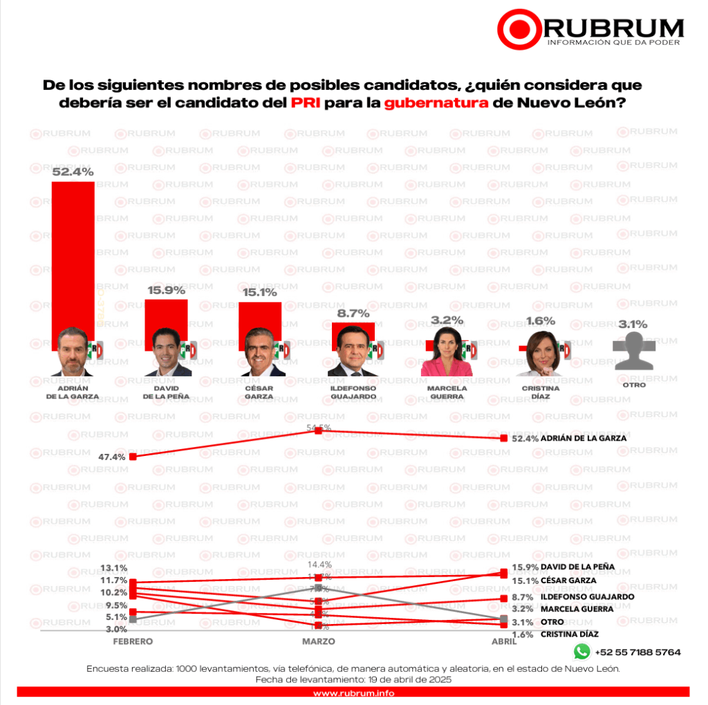 - PRI: Adrián de la Garza lidera las preferencias, seguido de David de la Peña y César Garza.