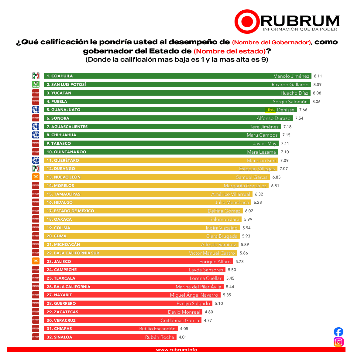 En el extremo opuesto, Rubén Rocha (4.19), Cuitláhuac García (4.15) y Rutilio Escandón (3.90) son los peor evaluados en este rubro.