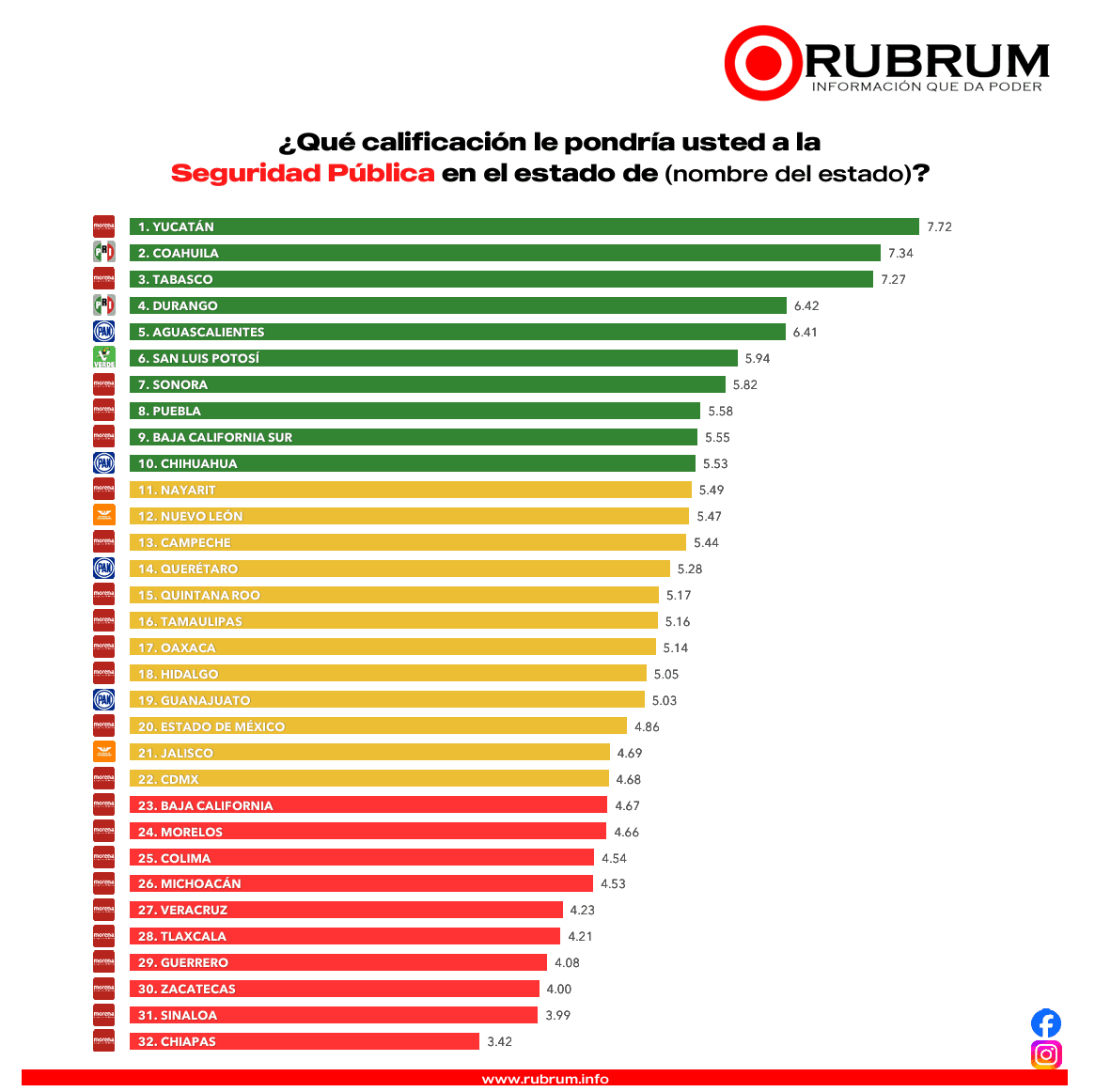 En el ámbito de seguridad, Yucatán (7.72) y Coahuila (7.34) lideran la evaluación, seguidos por Tabasco (7.44). El estado de Durango se posiciona como el cuarto lugar (6,42).