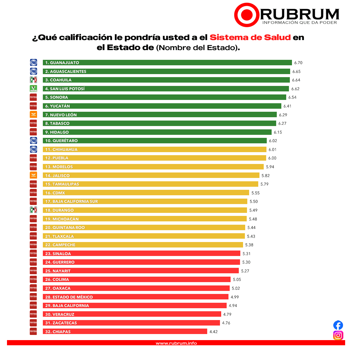 Guanajuato se posiciona como el estado con el mejor sistema de salud (6.70), seguido por Aguascalientes (6.65) y Coahuila (6.64).