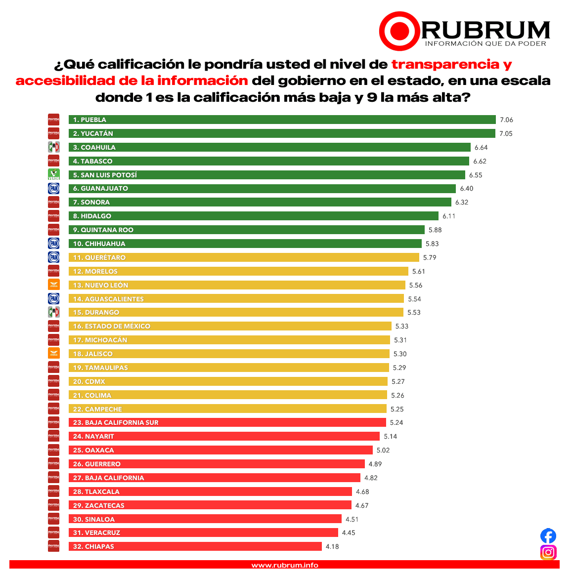 En nivel de transparencia y accesibilidad de la información del gobierno, el estado de Puebla (7.06) encabeza la lista, le sigue Yucatán (7.05) y Coahuila (6.64).