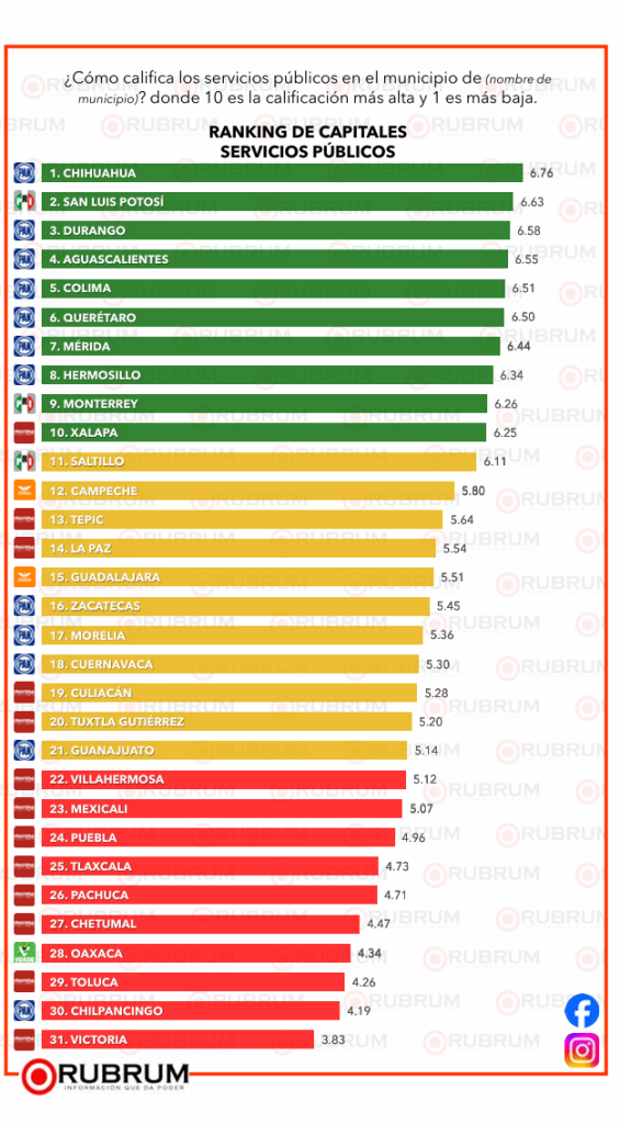 Chihuahua, San Luis Potosí, Durango, Aguascalientes y Colima fueron los mejores evaluados; contrario a Victoria, Chilpancingo, Toluca, Chetumal y Oaxaca.