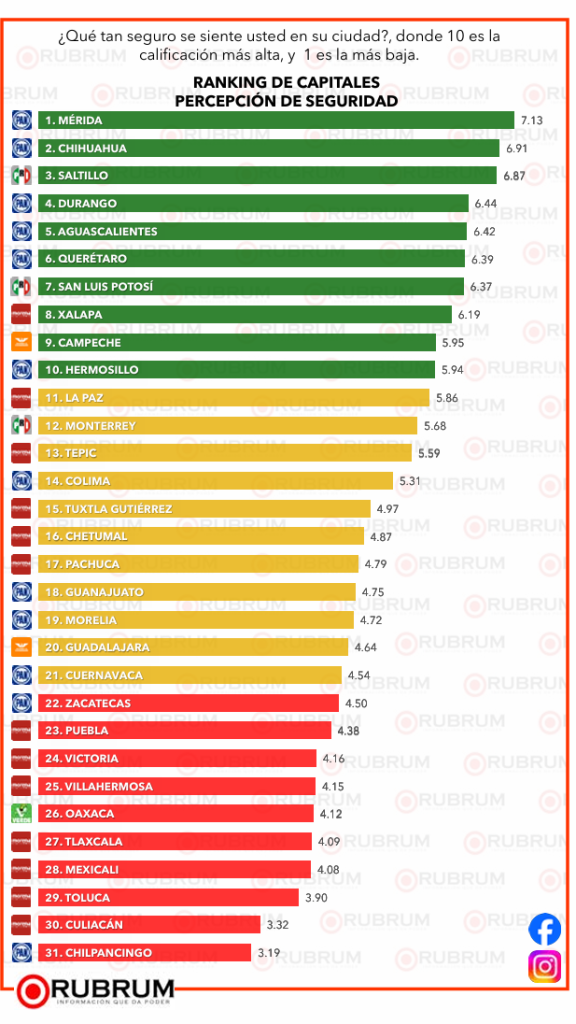 Mérida con Cecilia Patrón sigue en la cabeza en cuanto a percepción de seguridad; mientras que Victoria con el gobierno de Eduardo Gattas es calificado al final del ranking, lo que refleja una mayor percepción de inseguridad.