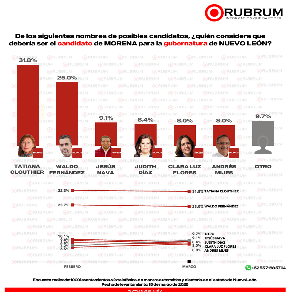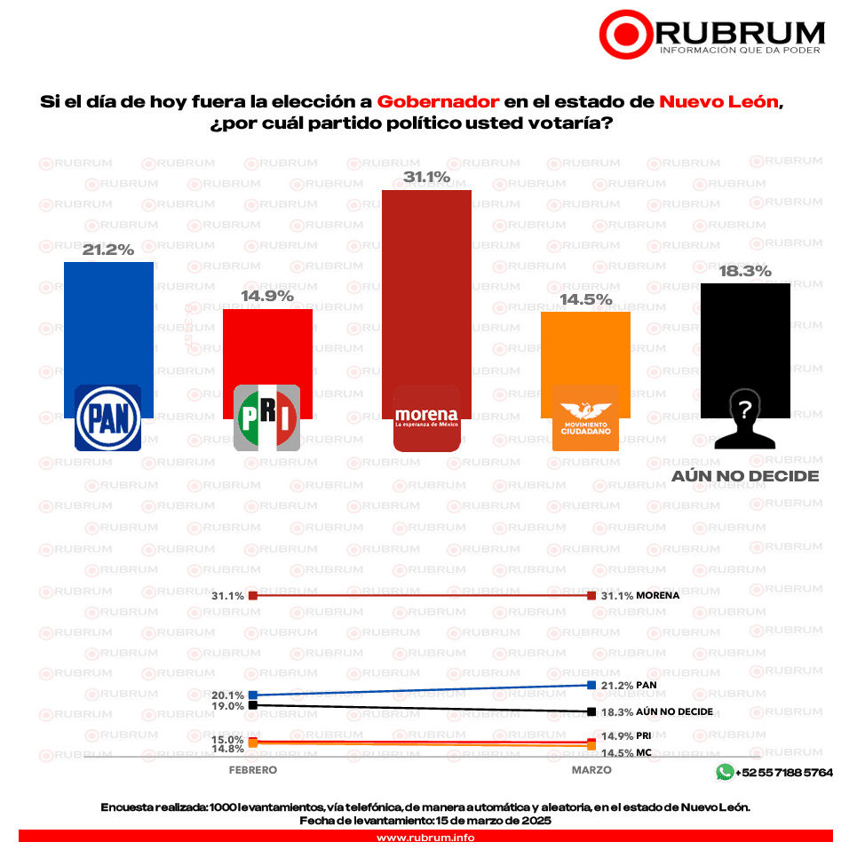 La encuesta de preferencia realizada por RUBRUM en marzo con respecto a la elección del 2027 en Nuevo León, arrojó que si hoy fuera la elección a gobernador en el estado un 31.1% por ciento votaría por Morena. Es decir que solo 3 de cada 10 neoloneses votarían por el partido oficialista federal.