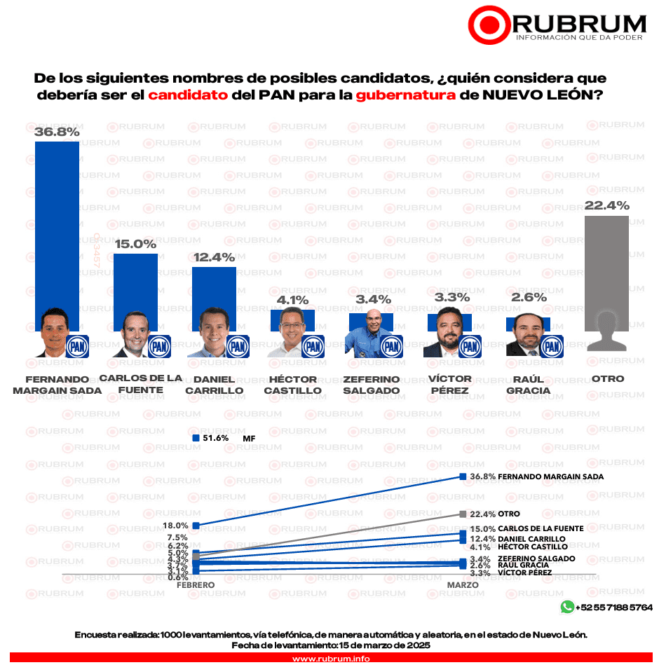 - PAN: Fernando Margáin se posiciona como el aspirante más fuerte dentro del partido, superando a Carlos de la Fuente y Daniel Carrillo.