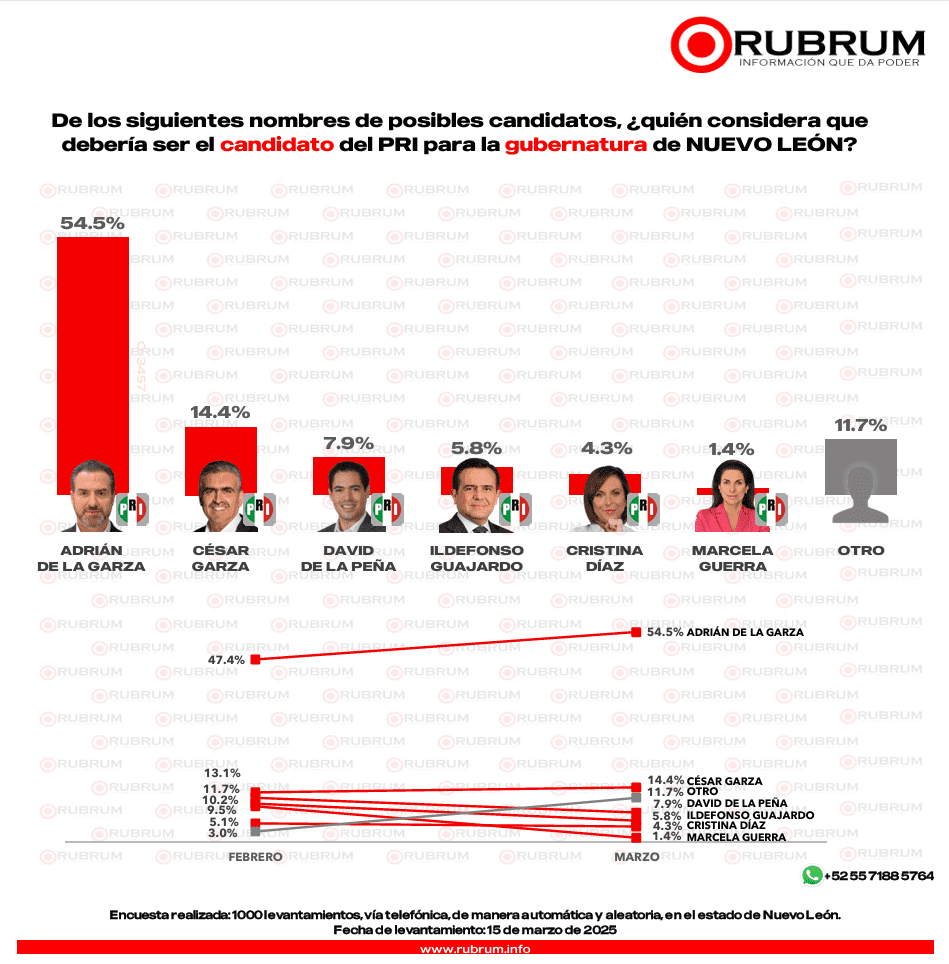 Los considerados a ser candidatos por el Partido Revolucionario Institucional (PRI) son: Adrián de la Garza, alcalde de Monterrey y César Garza, exalcalde de Apodaca. El primero con un 54.5% por ciento, mientras que el segundo se ubica por debajo, con el 14.4%.