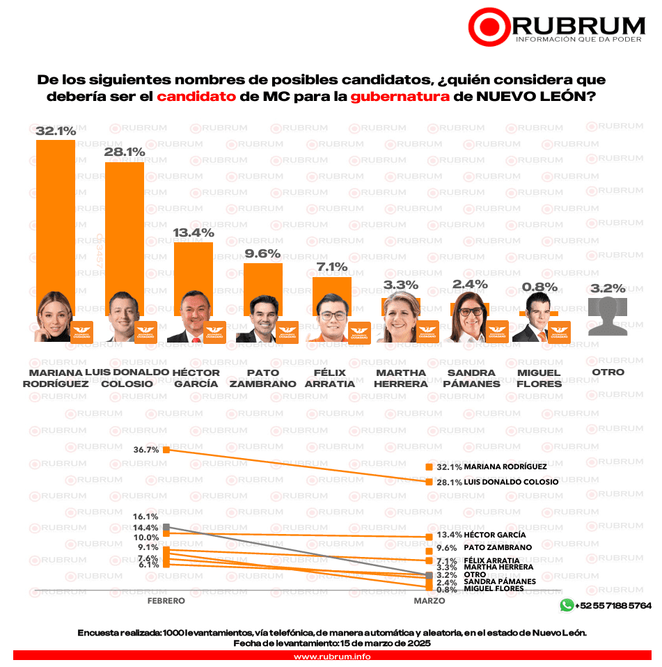 RUBRUM presenta su encuesta de marzo sobre el panorama electoral en Nuevo León con miras a la gubernatura de 2027. Esta encuesta ciudadana mide la intención de voto por partido y la intención de voto interno.