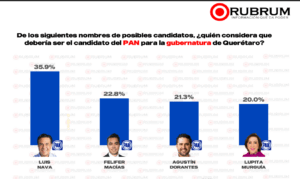 Dentro de las internas del PAN, Luis Nava se destaca con un 35.9% de apoyo, superando a Felifer Macías (22.8%), Agustín Dorantes (21.3%), y Lupita Murguía (20.0%).