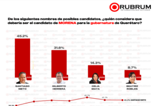 En el caso de Morena, Santiago Nieto se consolida como el favorito con un 45.2% de las preferencias para ser el candidato a la gubernatura, seguido por Gilberto Herrera (31.8%), Celia Maya (14.3%), y Beatriz Robles (8.7%).