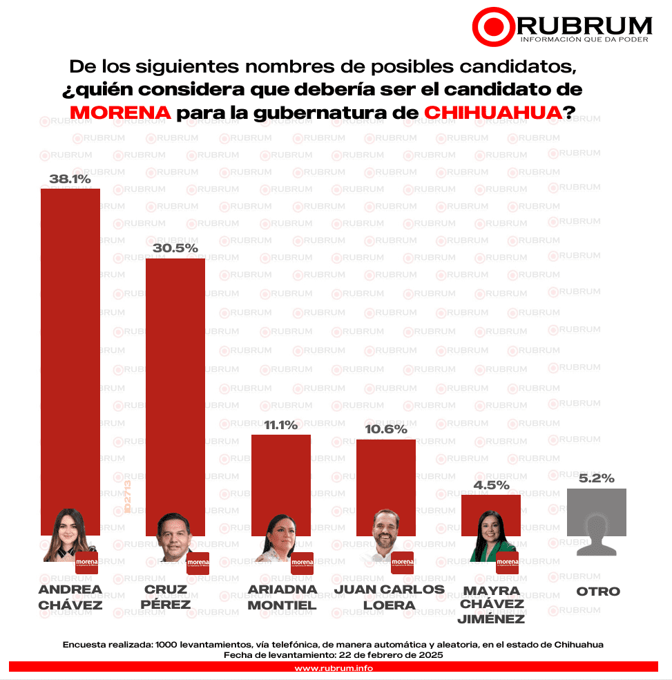 En Morena, la lista de aspirantes la lidera la senadora Andrea Chávez con 38.1% por ciento. Por debajo se encuentra Cruz Pérez Cuéllar, alcalde de Ciudad Juárez con 30.5% por ciento.