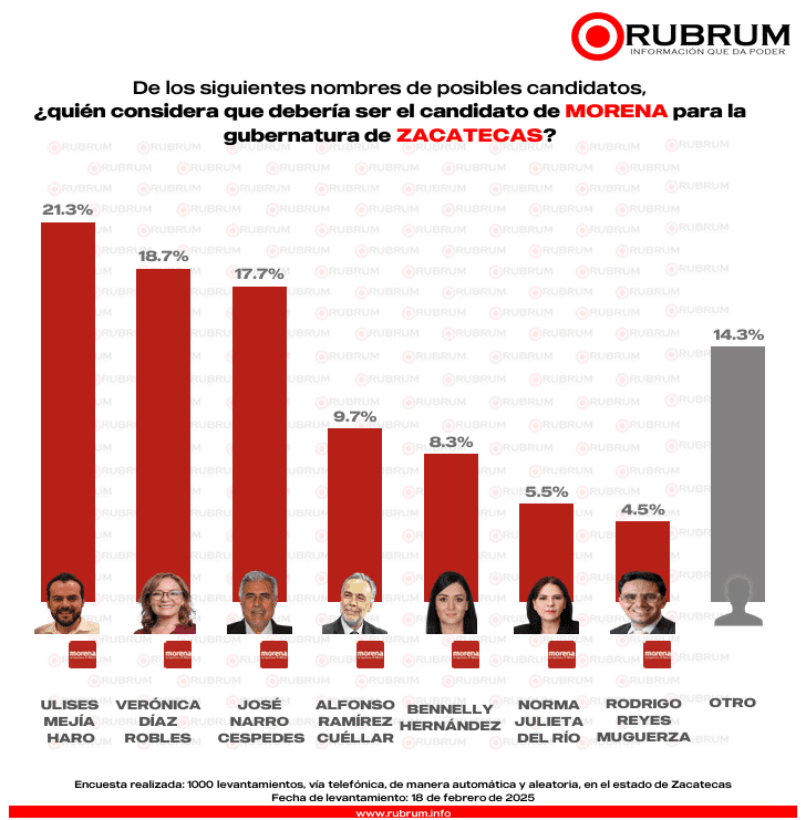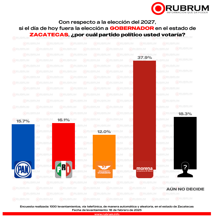La encuesta de preferencia ciudadana realizada por RUBRUM en febrero con respecto a la elección del 2027 en Zacatecas, arrojó que si hoy fuera la elección a gobernador en el estado, un 37.9% por ciento votaría por Morena. En contraste con la evaluación de enero, el partido oficialista desciende casi cinco puntos.