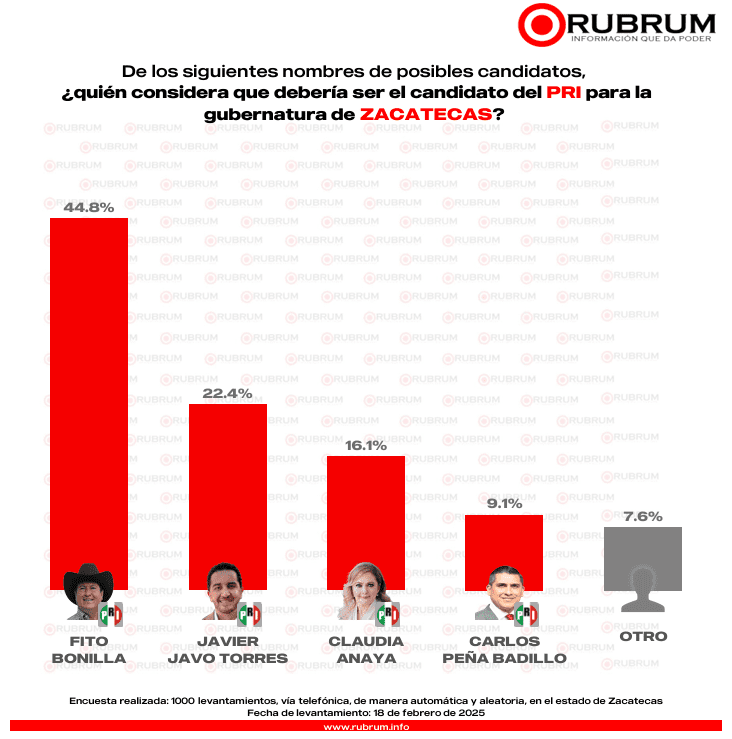 En el Partido Revolucionario Institucional (PRI), el secretario del Campo, Adolfo “Fito” Bonilla continúa en ventaja interna con el 44.8%. Mientras que el alcalde de Fresnillo, Javier Javo Torres desbanca a Carlos Peña Badillo, presidente estatal del PRI con un con el 22.4%.