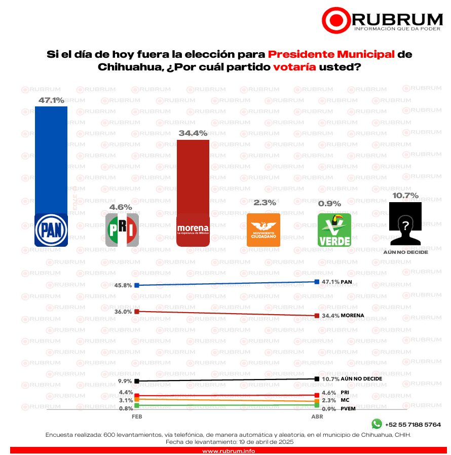 En la última encuesta de preferencia realizada por RUBRUM, el Partido Acción Nacional (PAN) se consolida en la ciudad de Chihuahua con la mayor intención de voto ciudadano por partido con un 47.1%, seguido por Morena como la segunda fuerza política más fuerte en la región con un 34.4% por ciento.