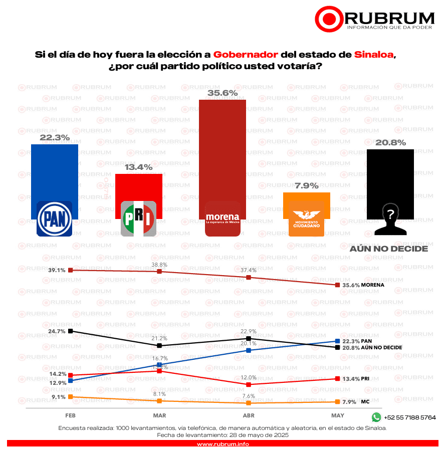 La encuesta de preferencia realizada por RUBRUM en mayo con respecto a la elección del 2027 en Sinaloa, arrojó que si hoy fuera la elección a gobernador en el estado un 35.6% por ciento votaría por Morena.