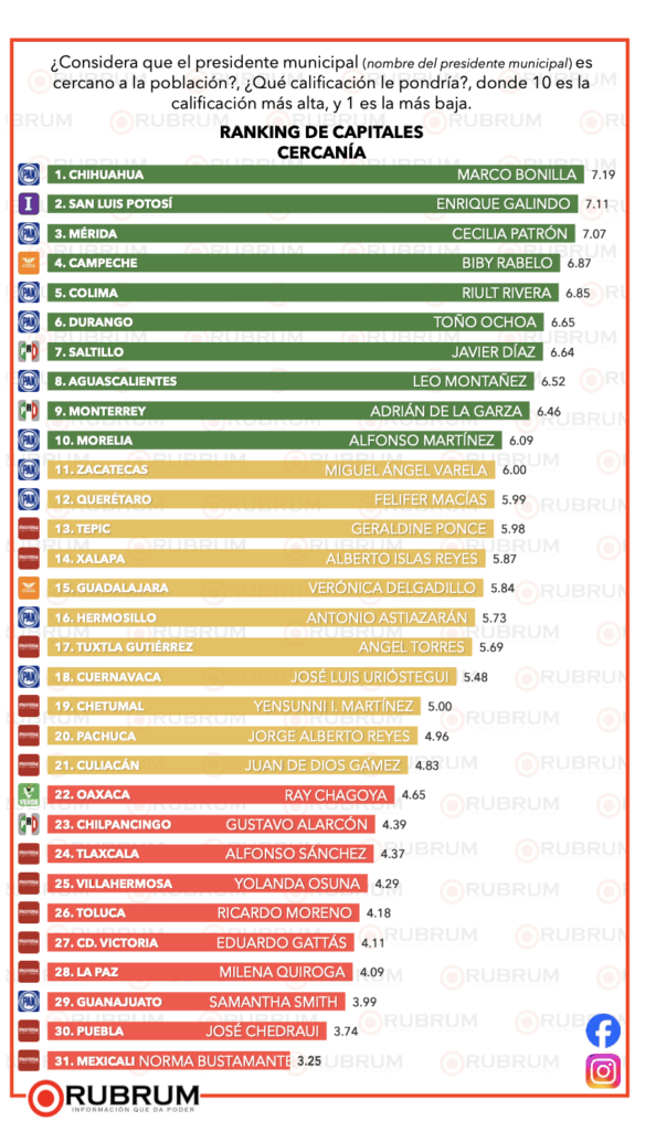 Marco Bonilla de Chihuahua es el edil con una mejor evaluación entorno a la cercanía ciudadana, junto a: Enrique Galindo de San Luis Potosí; Cecilia Patrón de Mérida; Bibi Rabelo de Campeche y Riult Rivera de Colima.