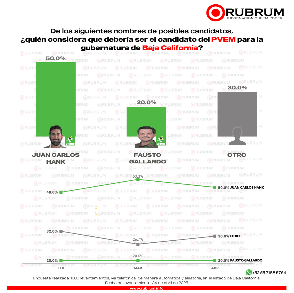 La encuesta de preferencia ciudadana realizada por RUBRUM en abril con respecto a la elección del 2027 en Baja California, arrojó que si hoy fuera la elección a gobernador en el estado, un 48.3% por ciento votaría por Morena.
