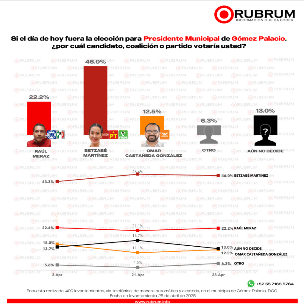 La casa encuestadora RUBRUM presentó los resultados de su más reciente estudio de intención de voto correspondiente al mes de abril, en el contexto de las elecciones municipales que se celebrarán en Durango, Gómez Palacio y Lerdo en junio.