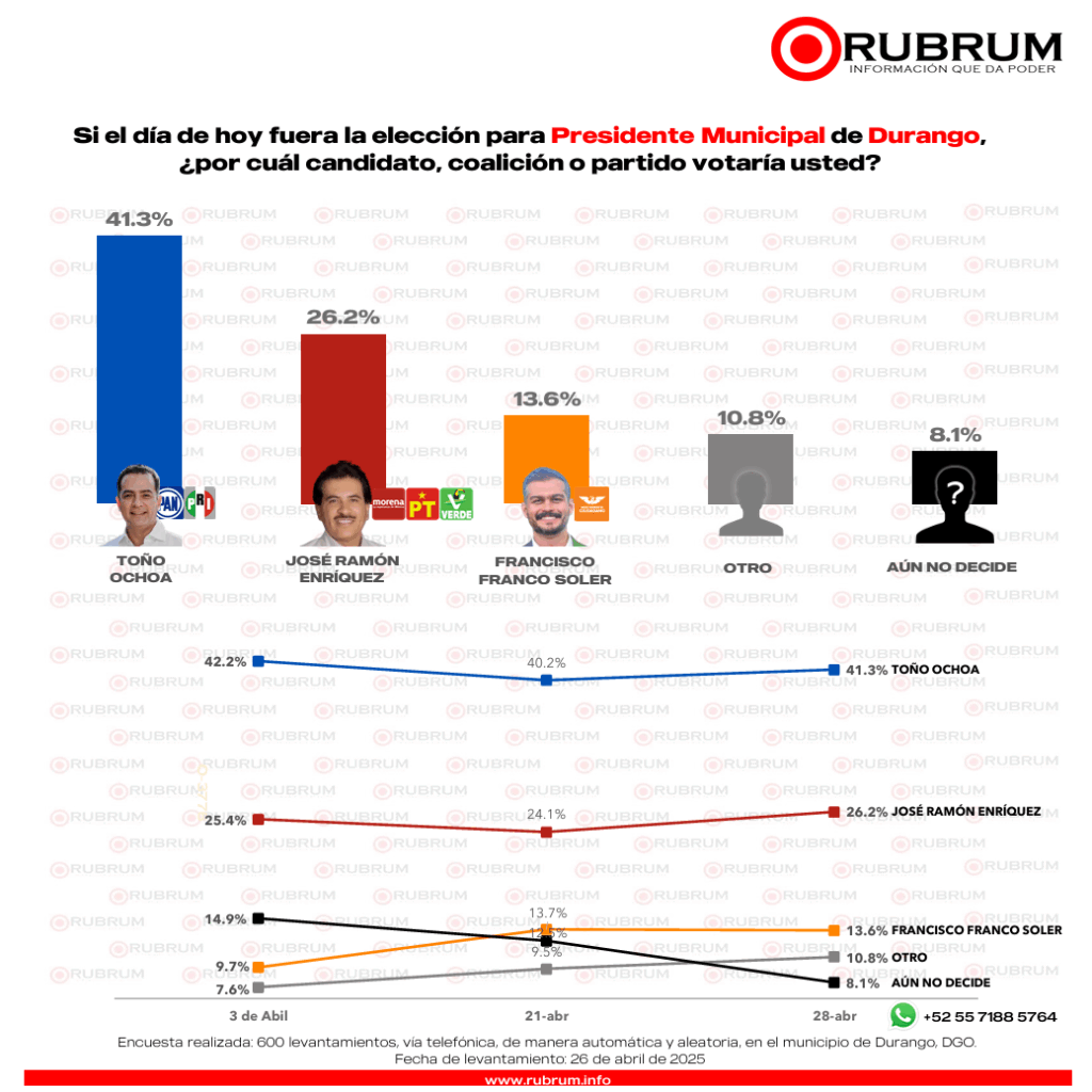 - En Durango capital, Toño Ochoa del PAN-PRI mantiene una ventaja de 15 puntos sobre José Ramón Enríquez de Morena. Francisco Franco de MC se ubica en tercer lugar con 13.6% por ciento. Hay un 15 por ciento de indecisos.