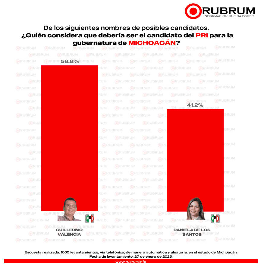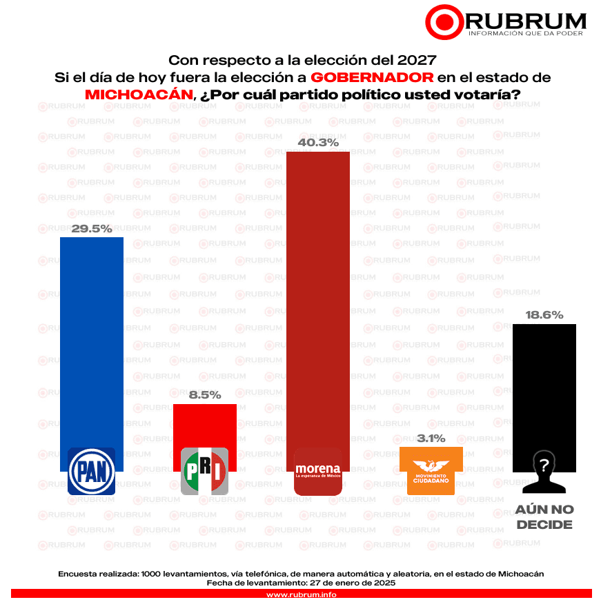 La encuesta de preferencia ciudadana realizada por RUBRUM en enero con respecto a la elección del 2027 en Michoacán, arrojó que si hoy fuera la elección a gobernador en el estado un 40.3% por ciento votaría por Morena.