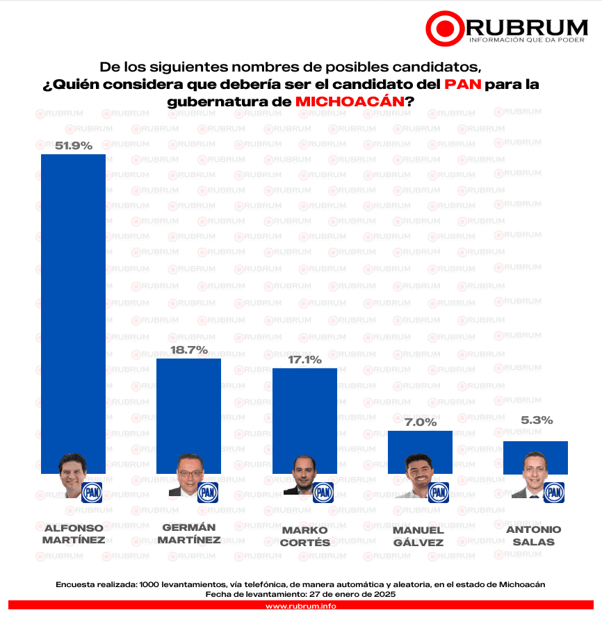 En el Partido Acción Nacional (PAN), la lista de aspirantes para la gubernatura de Michoacán la encabeza el alcalde de Morelia, Alfonso Martínez con un 51.9% por ciento.