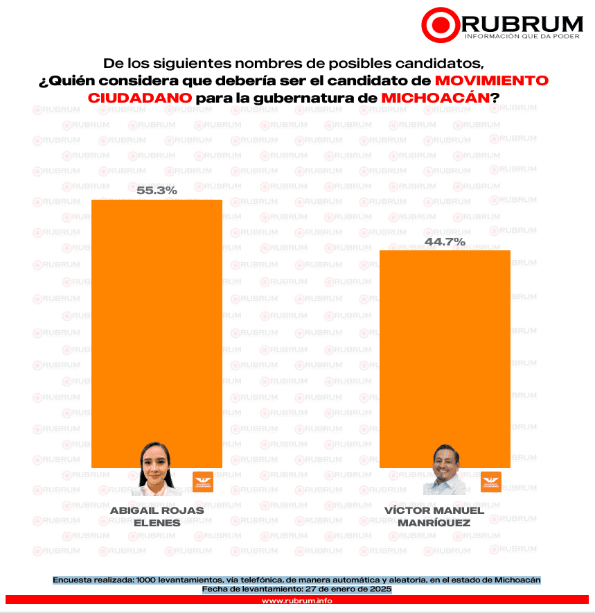 El 55.3% por ciento del electorado encuestado favorece a Abigail Rojas Elenes como posible aspirante a la gubernatura de Michoacán por Movimiento Ciudadano.